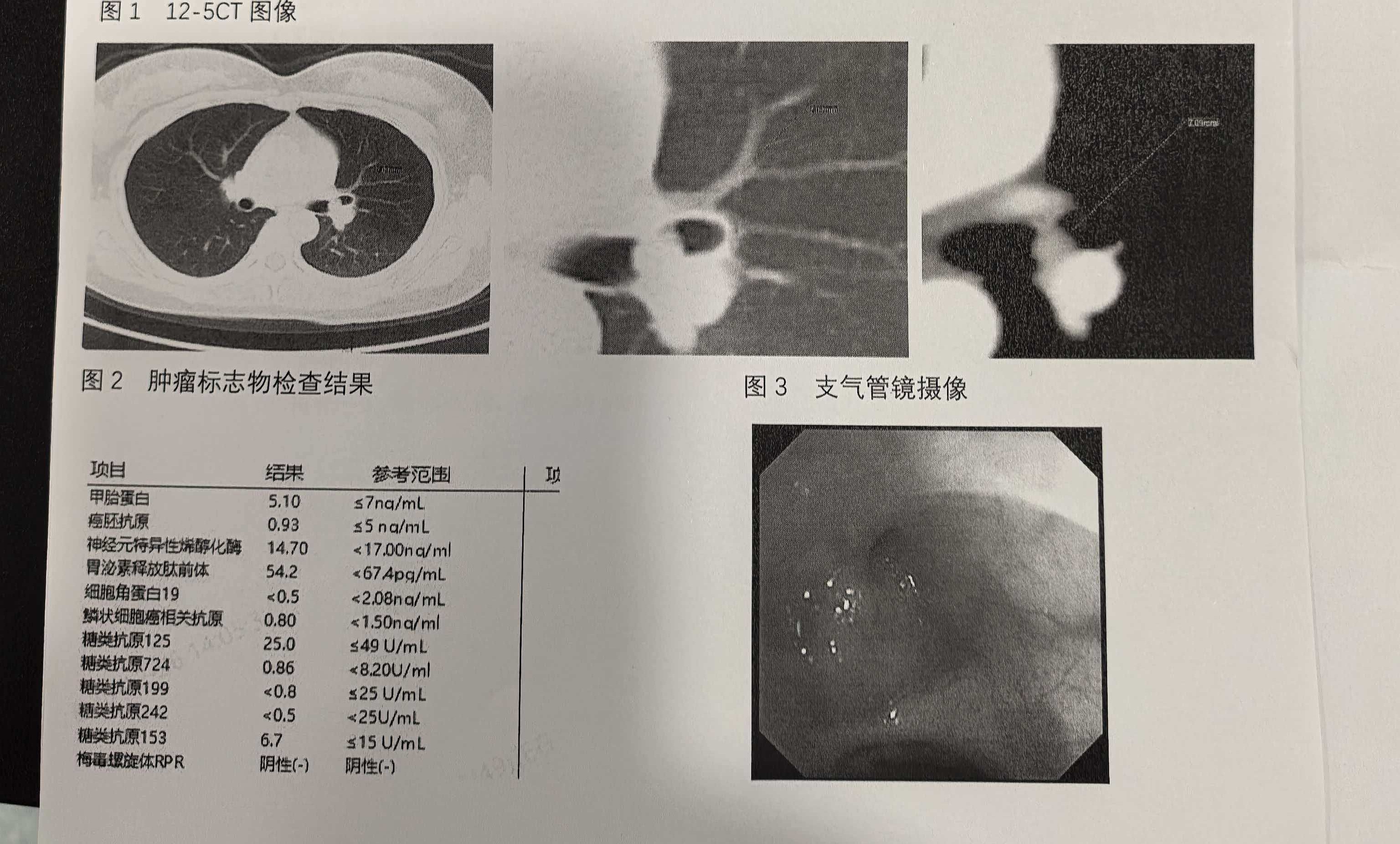 2025年12月5日住院肺CT提示:“左肺上叶支气管腔内见类圆形小结节影,长径约7mm,CT值约45HU,远端支气管显示,增强后可见强化。右肺上叶后段、右肺水平裂见实性结节。左肺下叶少许条索影。两肺门区未见异常密度影。 |