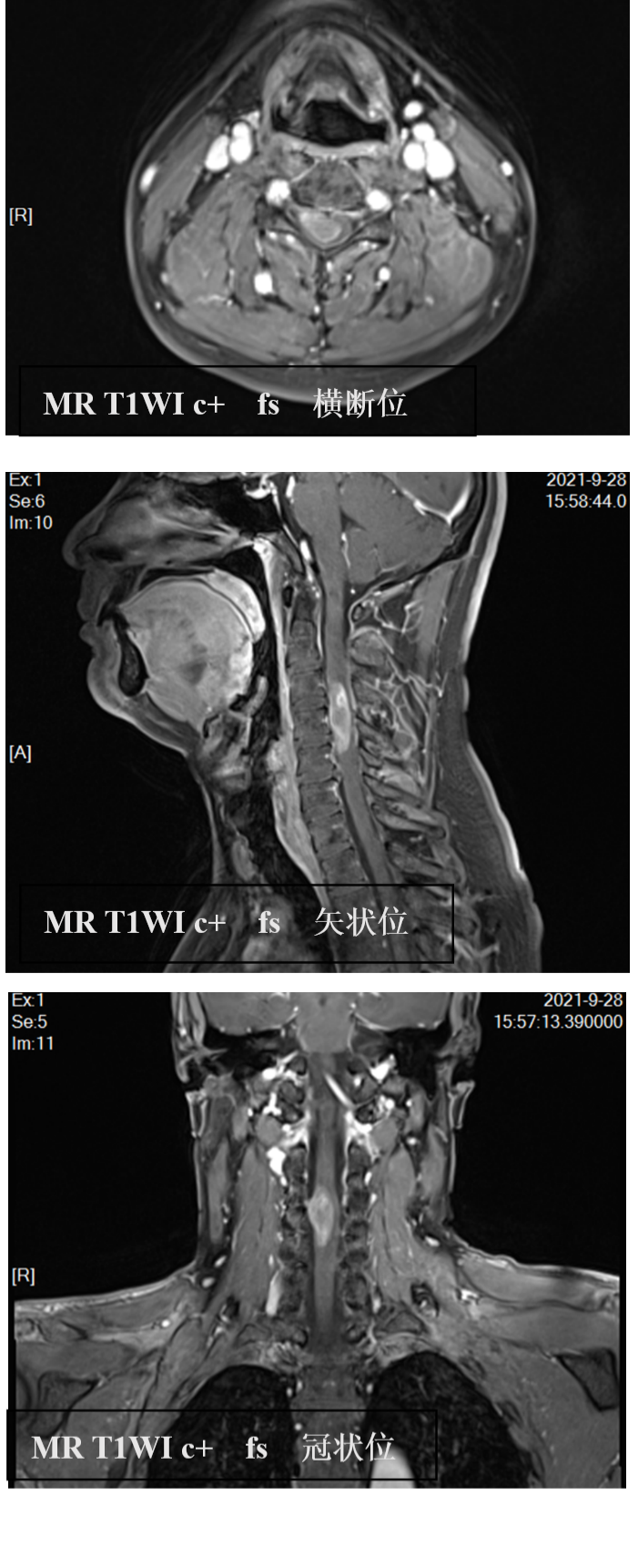 患者详情: 现病史:患者1月前无明显诱因下出现右上肢乏力,有麻木感,持重物不能,进行性加重。体格检查:右侧耸肩肌力、肩关节外展肌力、屈肘、伸肘肌力IV-级,双手握力5级,双肩关节外展受限,右肘以下皮肤温觉痛觉感受减弱,余未见明显异常。既往史家族史无特殊。 术中所见:肿瘤以C4为中心,见肿瘤从髓内突破脊髓皮质于右侧前后根之间,肿瘤呈淡红色,质较脆,血供丰富,境界不清楚,与硬脊膜无粘连。 影像学:MR表现:颈椎增强成像序列:矢状面、横断面、冠状位 T1WI C+。颈椎生理曲度变直,椎体边缘可见骨质增生改变。C3-5椎体水平脊髓增粗、见一长椭圆形异常不均强化灶,大小约3.3x1.5x0.9cm,呈向右偏心性生长,自脊髓发出,平C4水平向右侧突出,强化不均,囊壁环形强化;病灶上方脊髓增粗,可见条状无强化低信号。颈椎MR增强示:C3-5水平脊髓内占位,考虑室管膜瘤可能。
