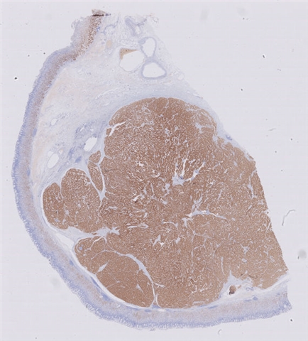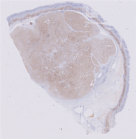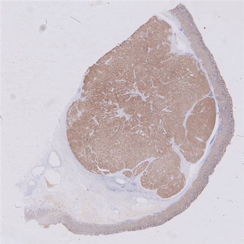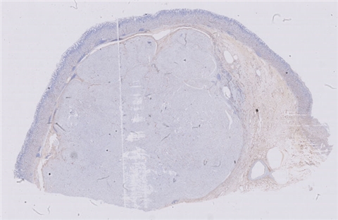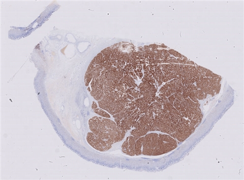 免疫组化: NSE(3+)、Syn(3+)、CgA(3+)、CD99胞质(+)、WT-1(+)、INI-1(+)、CK广谱(-)、CD10(-)、TFE3(-)、Inhibina(-)、HMB45(+)、CD56(3+)、TLE1(-)、S-100(+)、Pax-8(+)、calretin(-)、Alk(-)、Fil-1(-)、CyclinD1(-)