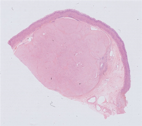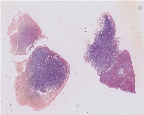 大体所见: 结节状组织一个: 4. 2cm*3cm*2.3cm,切面灰红灰黄。