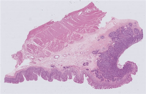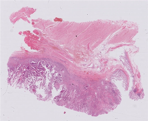 大体所见: 送检远端胃:小弯侧长8cm,大弯侧长16cm,临床已沿大弯侧剪开,距下切端4cm处小弯侧见一溃疡,大小1.8X1.5X00.3cm,切开切面灰白质韧,黏膜层与肌层游离。