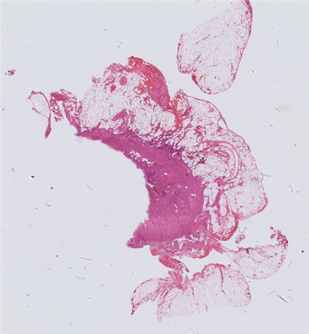 2、上切缘:灰褐色黏膜组织一块,大小1*1*0.4cm。