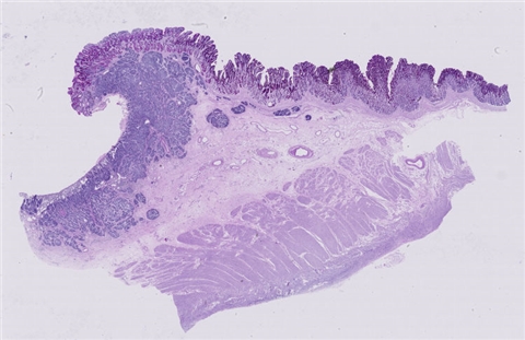 大体所见: 1、直肠癌肿物:已切开肠管一段,长10cm,一侧切缘周长4cm,另一侧切缘已缝合,长3cm,紧邻缝合切缘见一溃疡型肿物,大小4.5*4*3cm,肿物切面灰白灰黄色、质硬,与周围组织分界欠清,侵及全层。