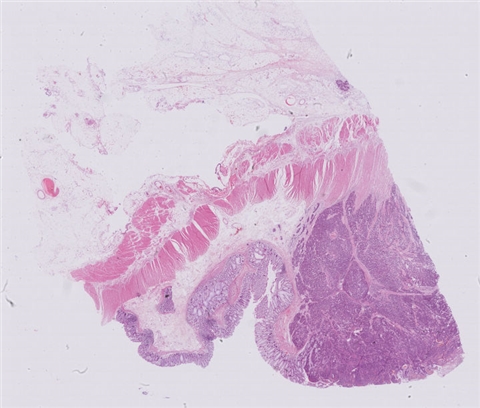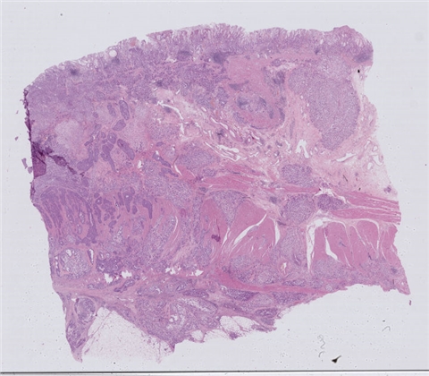 患者详情: 患者于半年前无明显诱因出现大便带血,为暗红色血便,未见粘液脓血便,反复发作,无腹痛腹胀,伴大便次数增多,并大便不成形,逐渐变细,初未引起重视,亦未行相应治疗,后症状逐渐加重。为进一步诊治,2020年3月入住我院。 直肠指诊:括约肌紧张度:正常,狭窄:无,触痛:无,距离肛门口大约4cm可及一环直肠一周肿块,质硬,移动度差,无压痛,指尖稍可通过肿块,指套染血:有。 电子肠镜示:距肛门4cm直肠处可见一巨大新生物,中间凹陷,底覆污秽苔,环2/3腔生长,钳取6块送病理,余 结肠各段粘膜光整,血管纹理清晰,未见明显的溃疡、息肉。 活检病理示:恶性肿瘤。后行腹腔镜直肠癌根治术。